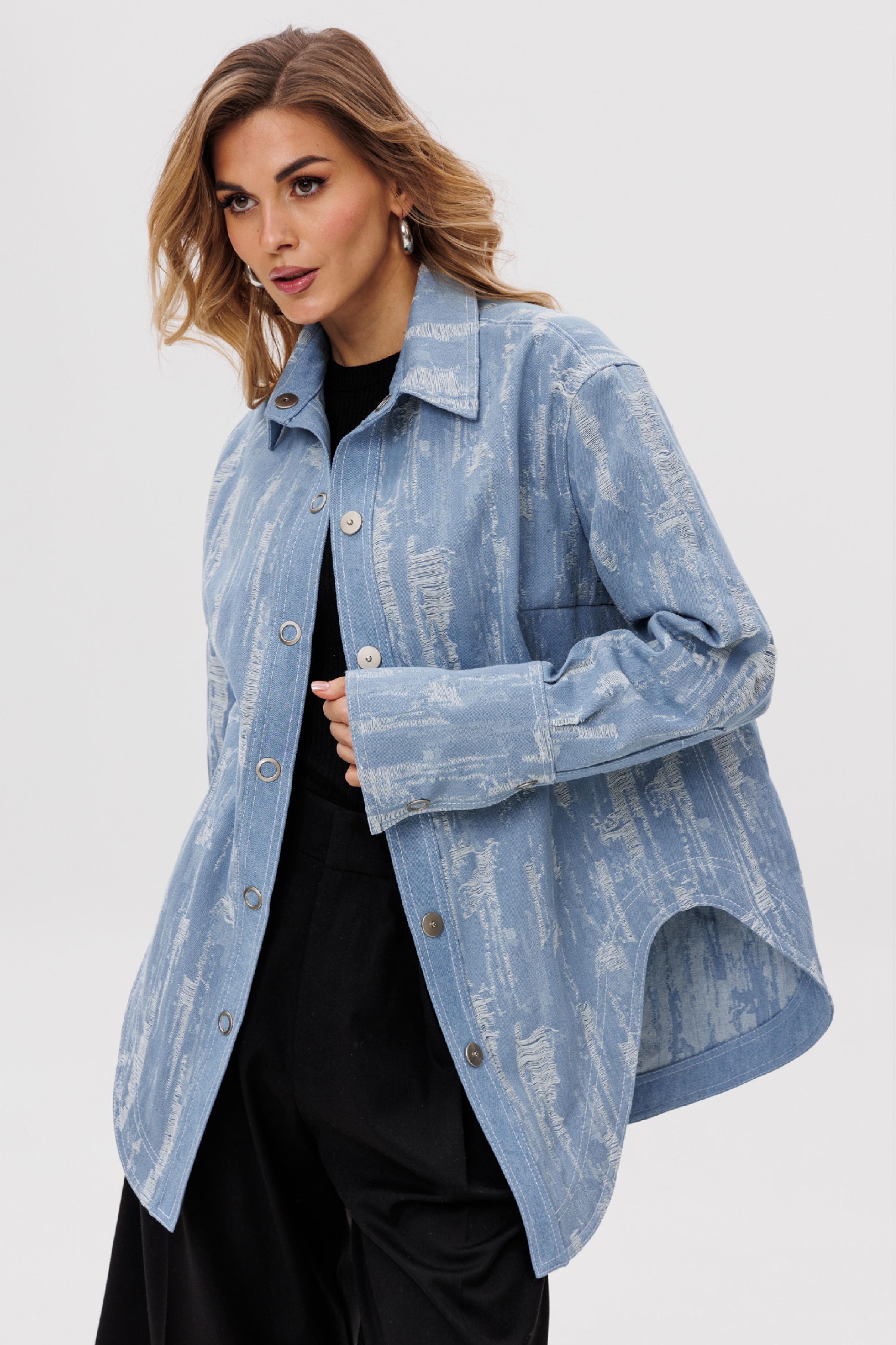 Блузка выполонена из джинса. Блузка прямого силуэта, длиной ниже линии бедер. Спереди застежка на кнопки. На спинке кокетка. Воротник стояче-отложной с отрезной стойкой. Рукав рубашечного покроя , одношовный. Низ рукава на притачной манжете. Низ блузки фигурной формы. В комплект входит съемный ремень из отделочной ткани. Длина блузки: р. 44-48 - 78 см, р. 50-54 - 79,5 см. Длина рукава: р. 44-48 - 80 см, р. 50-54 - 81 см.