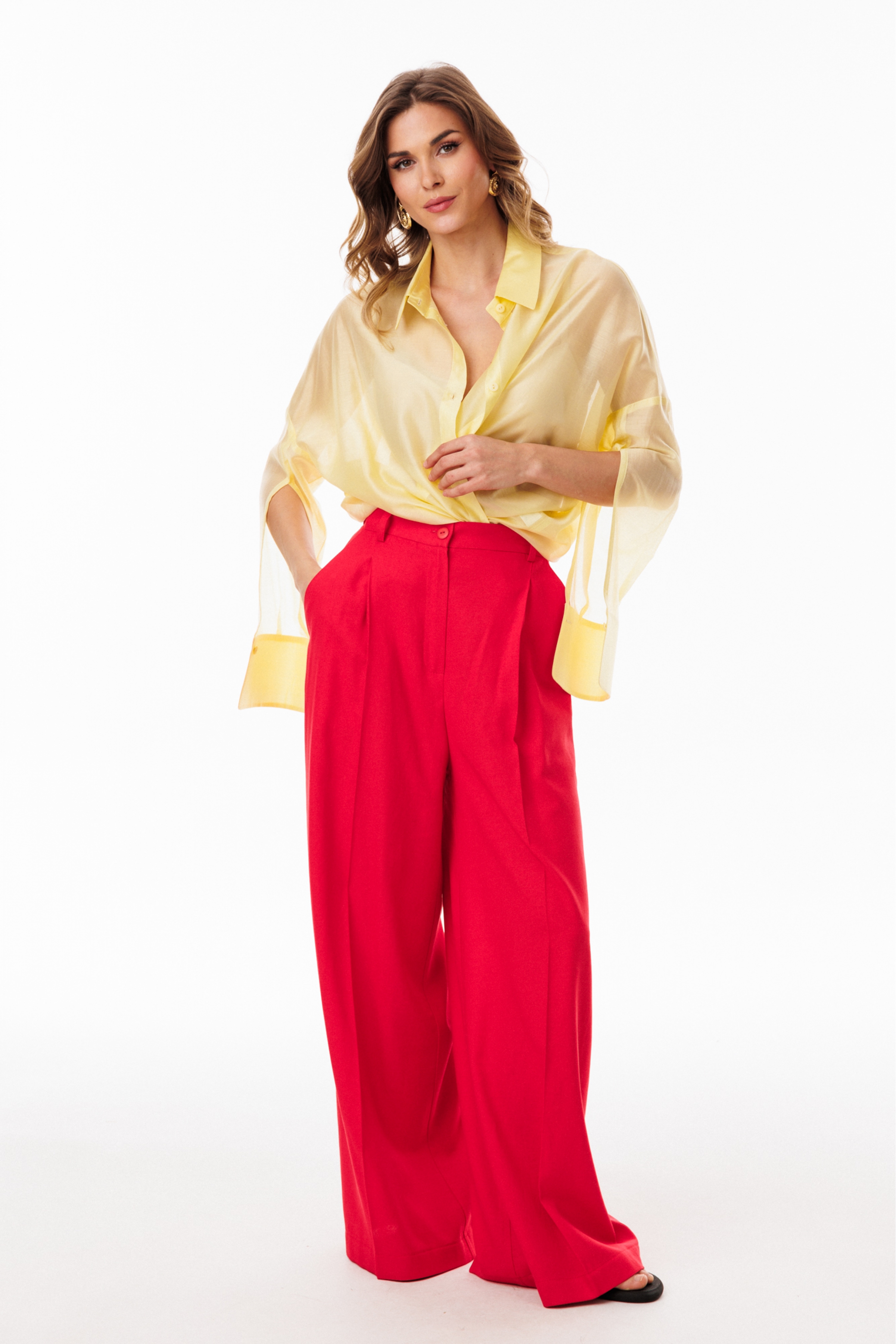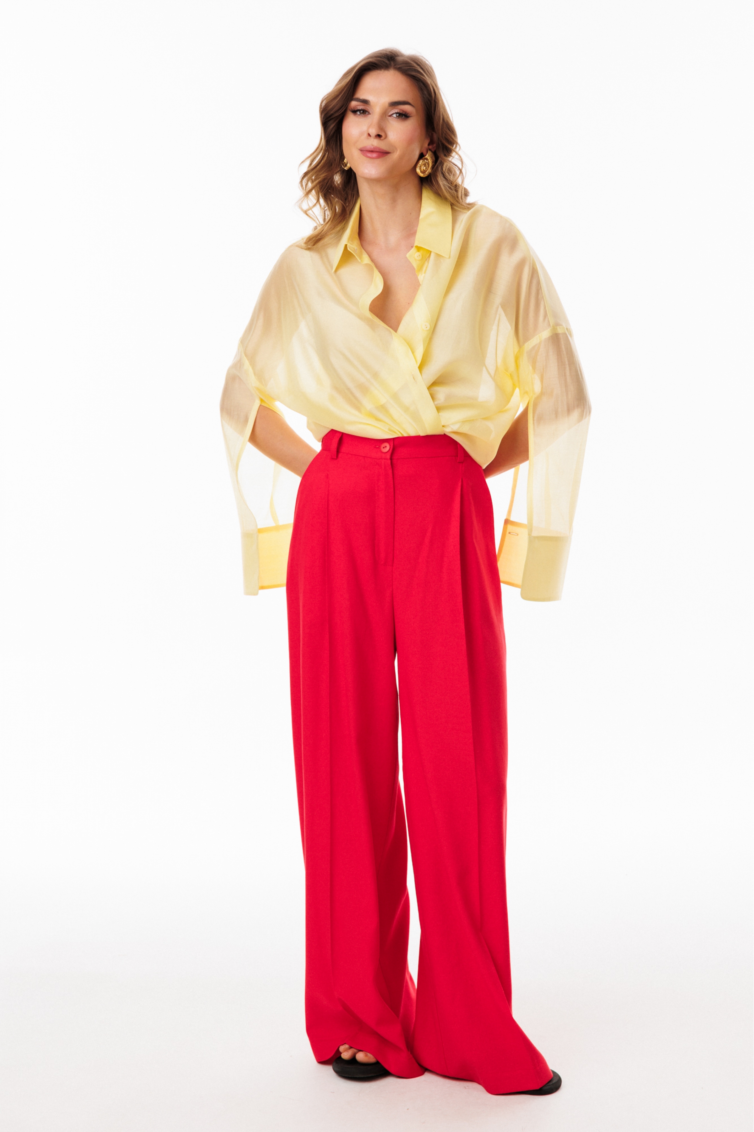 Блузка выполнена из плательно-блузочной ткани. Блузка прямого силуэта, покроя оверсайз, длиной ниже линии бедер. Спереди центральная застежка на пуговицы. Спинка цельная, длиннее переда. Воротник стояче-отложной. Плечевой шов спущен. Рукав рубашечного покроя, двухшовный, с прорезью по переду. Низ рукава на притачной манжете, застегивающейся на пуговицу. В боковых швах разрезы.