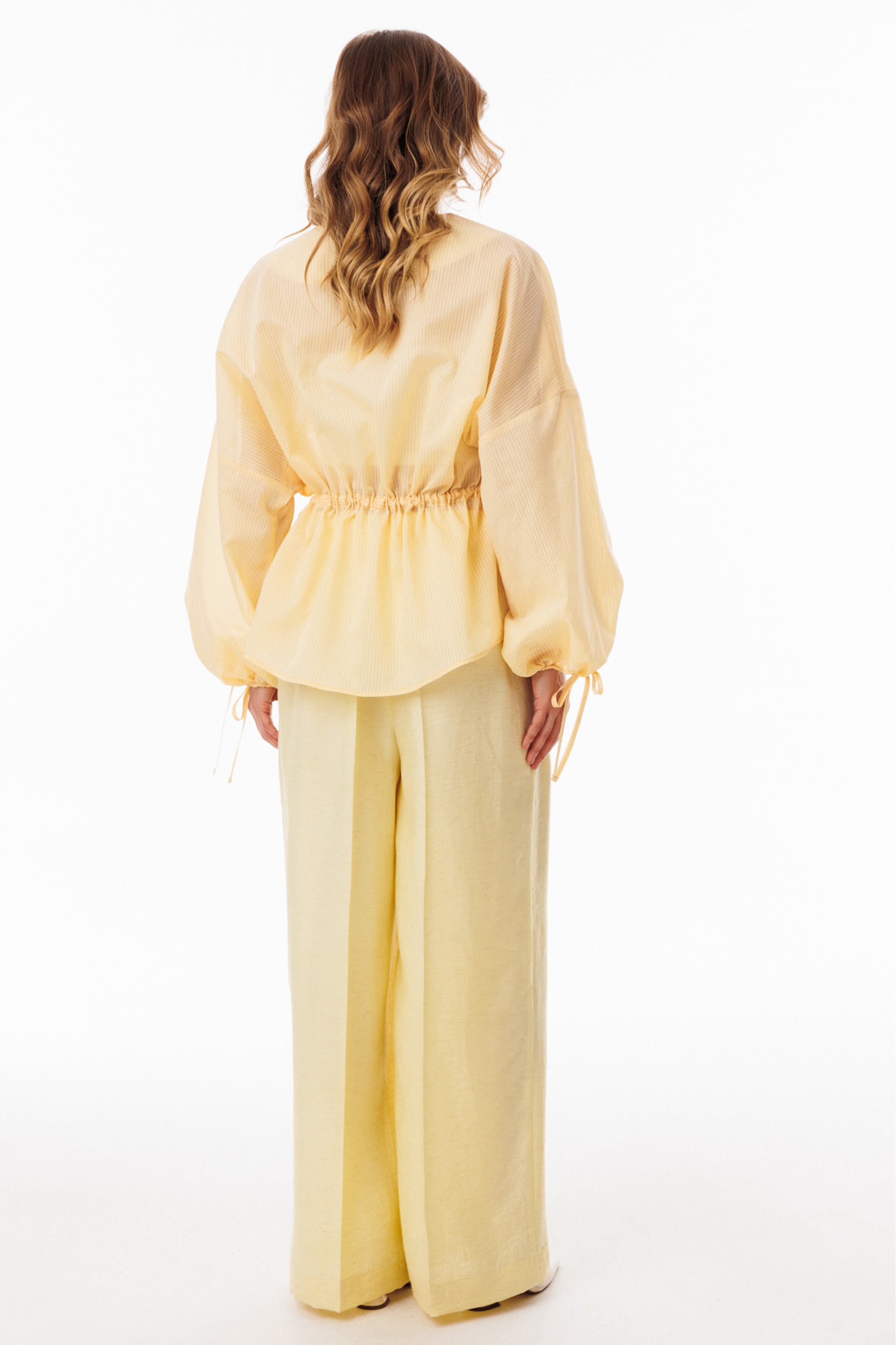 Брюки-палаццо выполнены из плательно-блузочной ткани. Брюки на притачном поясе, длиной в пол, расширенные к низу. Спереди складки и боковые карманы с наклонным входом. Застежка спереди на молнию с гульфиком и пуговицу. На задних частях обработаны талиевые вытачки.