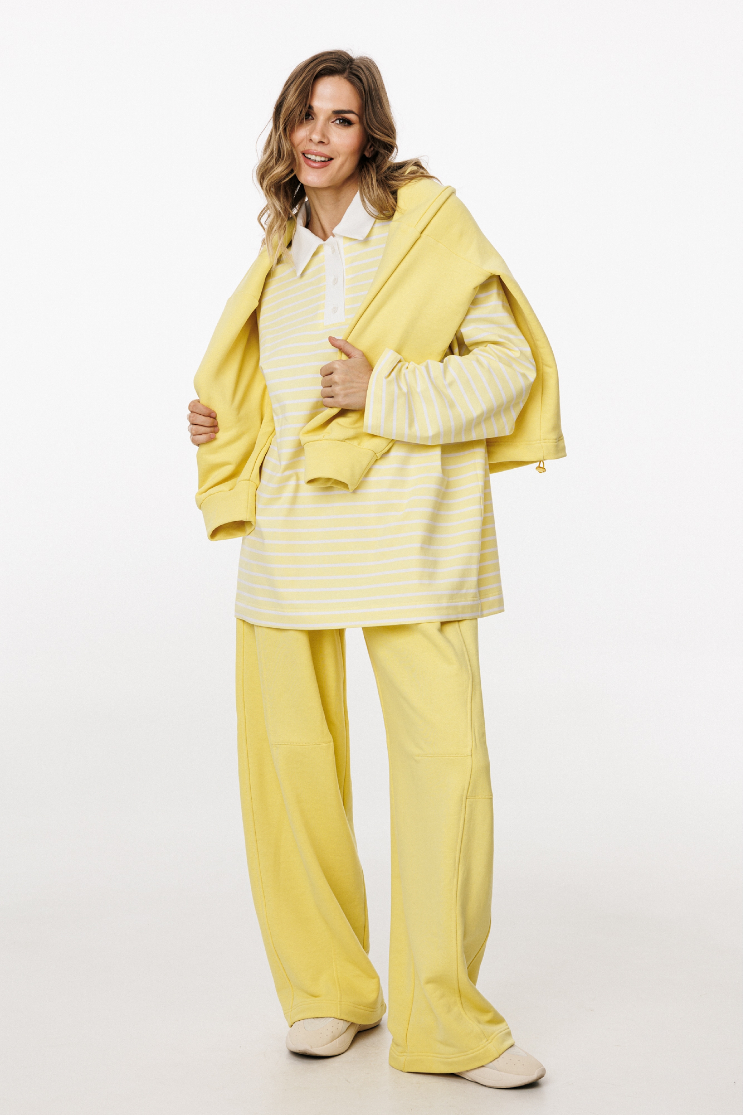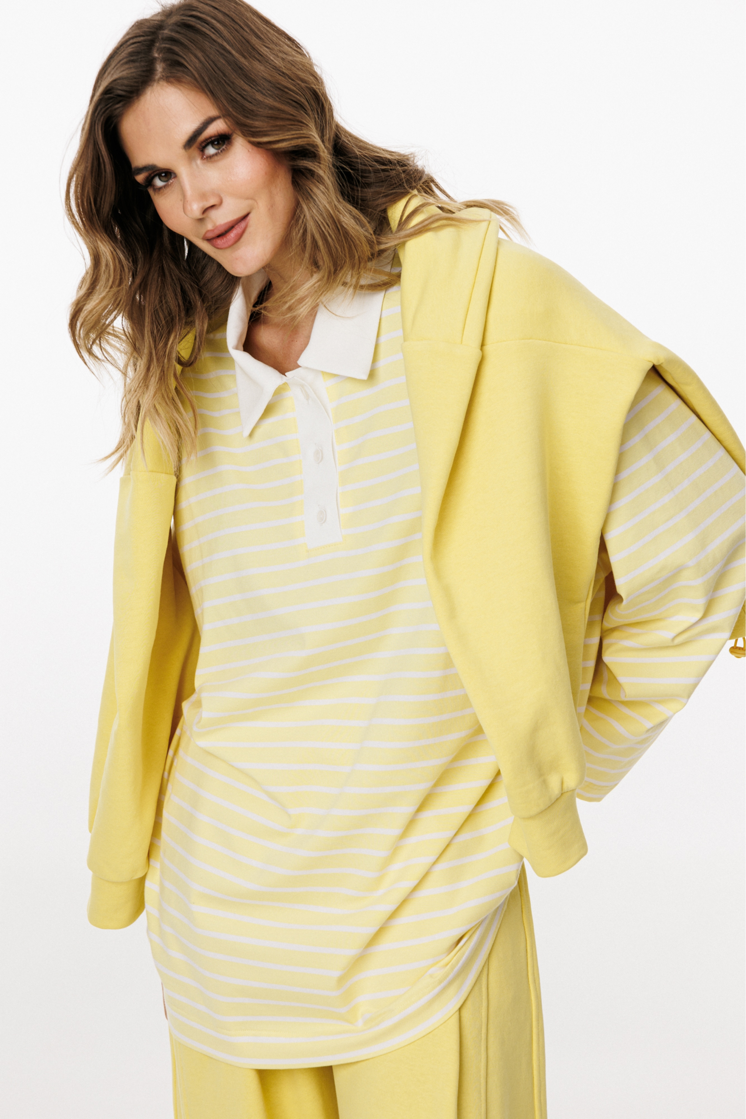 Джемпер выполнен из трикотажного полотна в полоску. Джемпер прямого силуэта, покроя oversize. Длиной до линии бедер. По переду обработана застежка на планке от горловины до линии груди. Горловина округлой формы, обработана воротником рубашечной формы. Плечевой шов удлинен. Рукав рубашечного покроя, одношовный. Планки и воротник выполнены из однотонного трикотажного полотна.