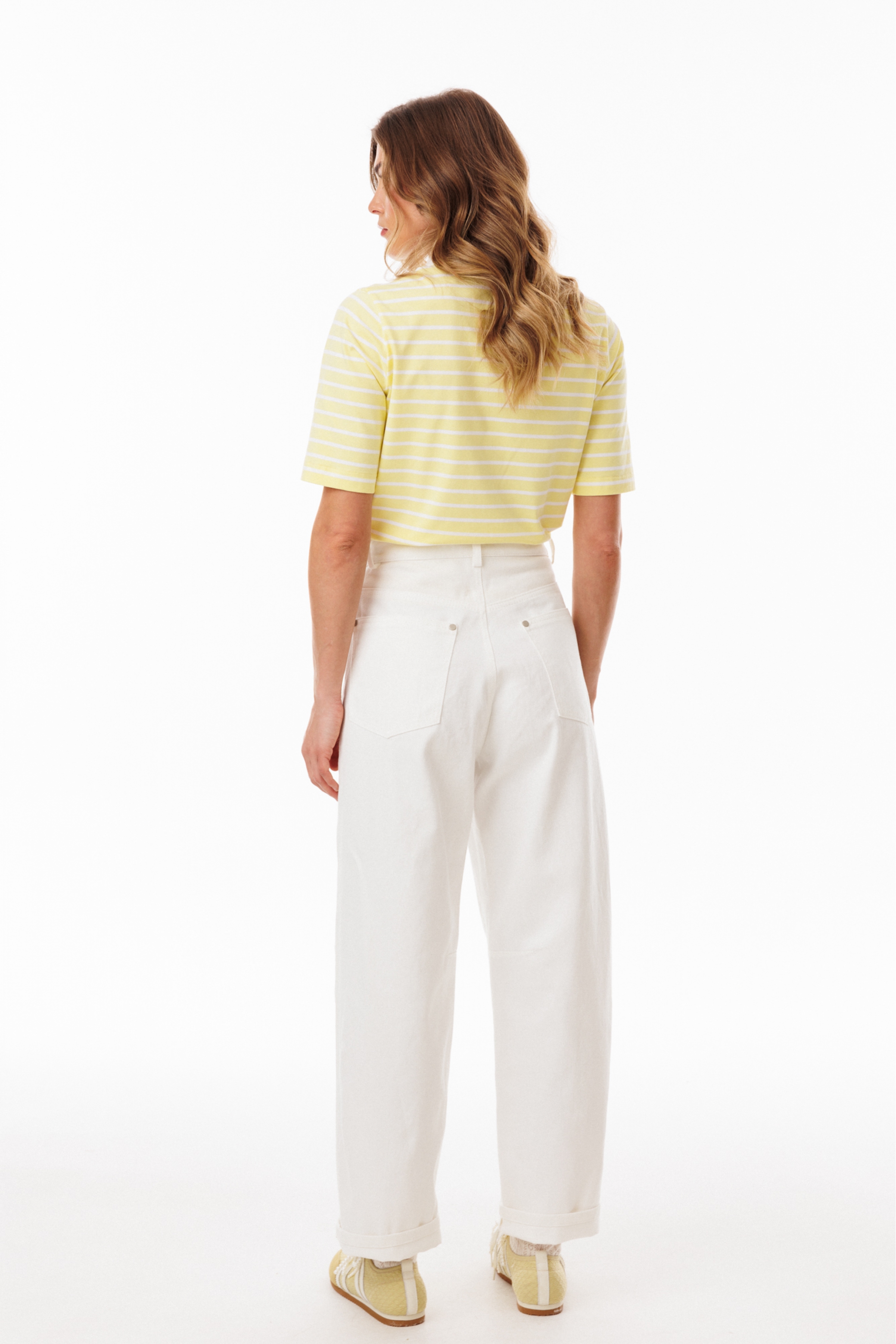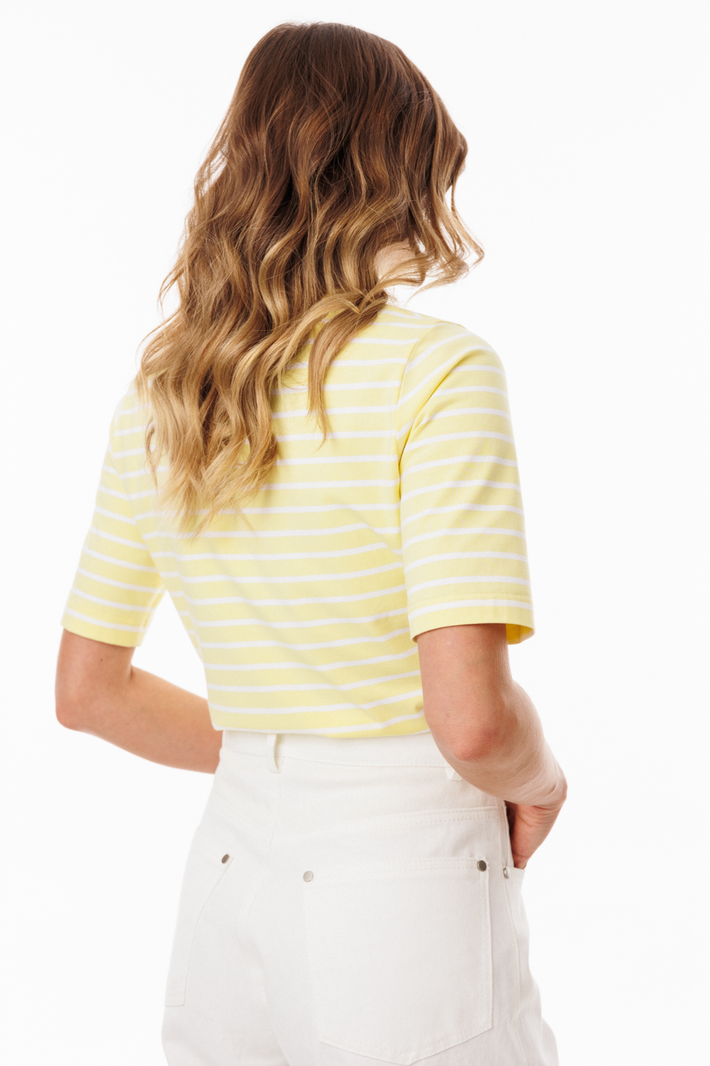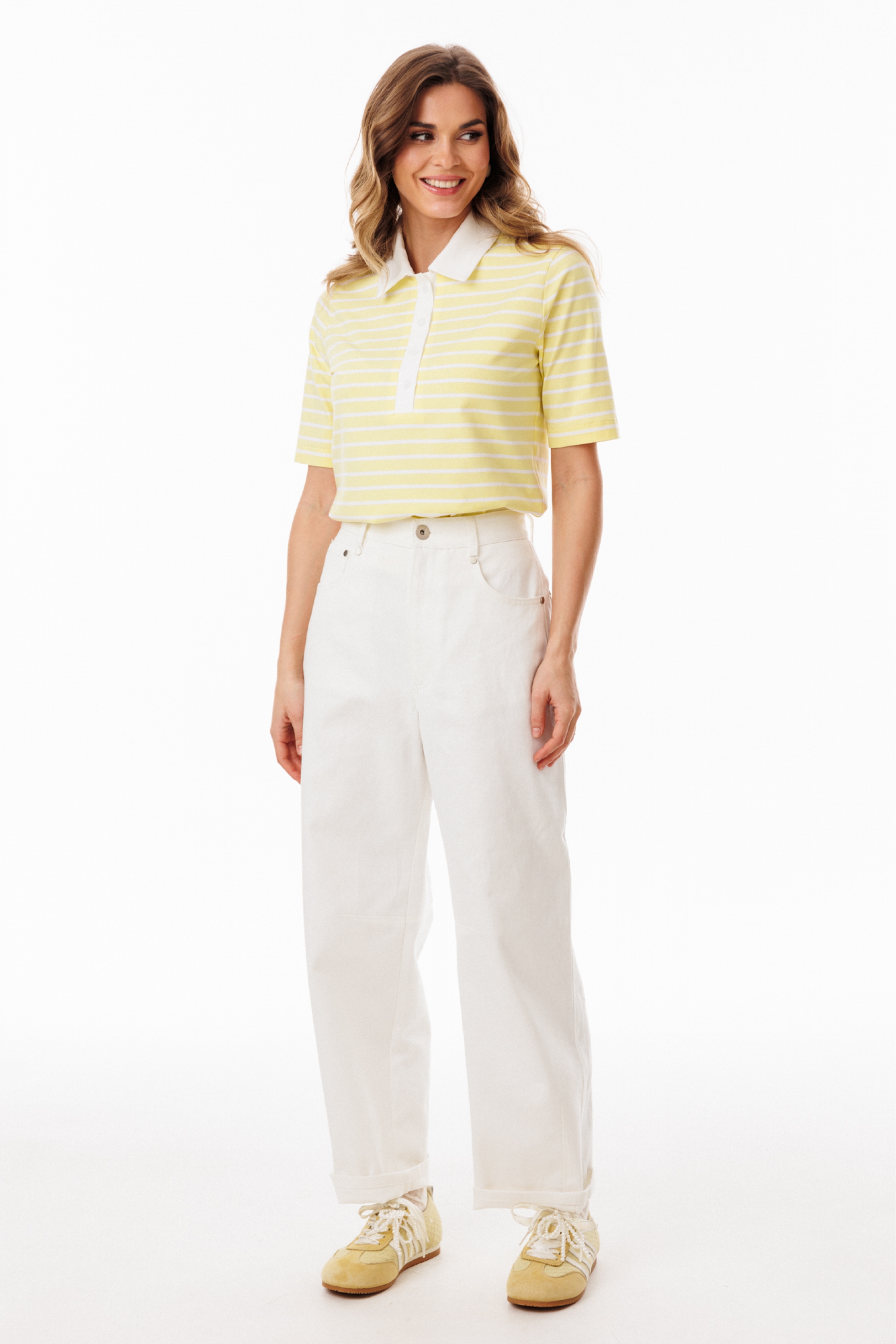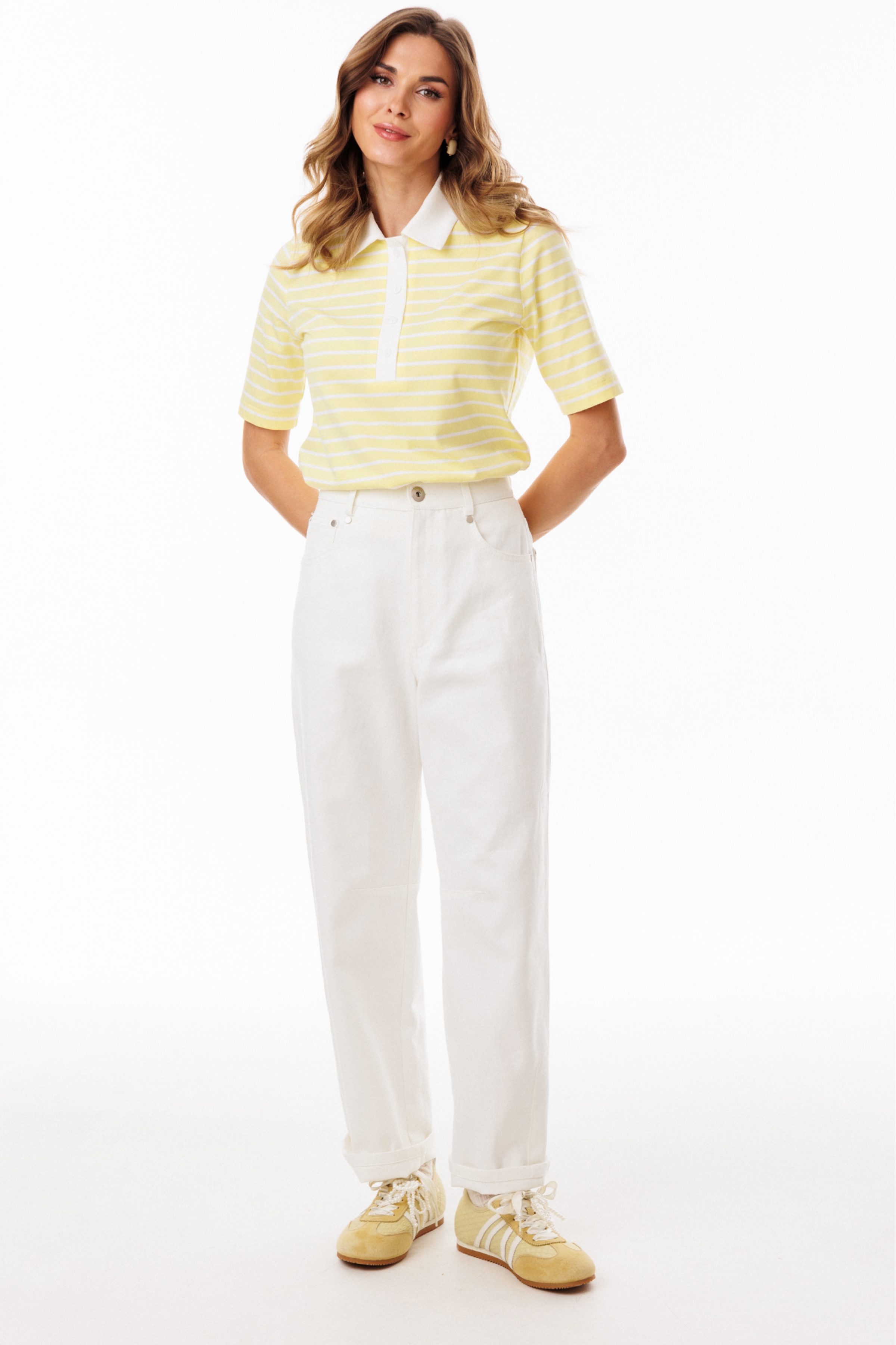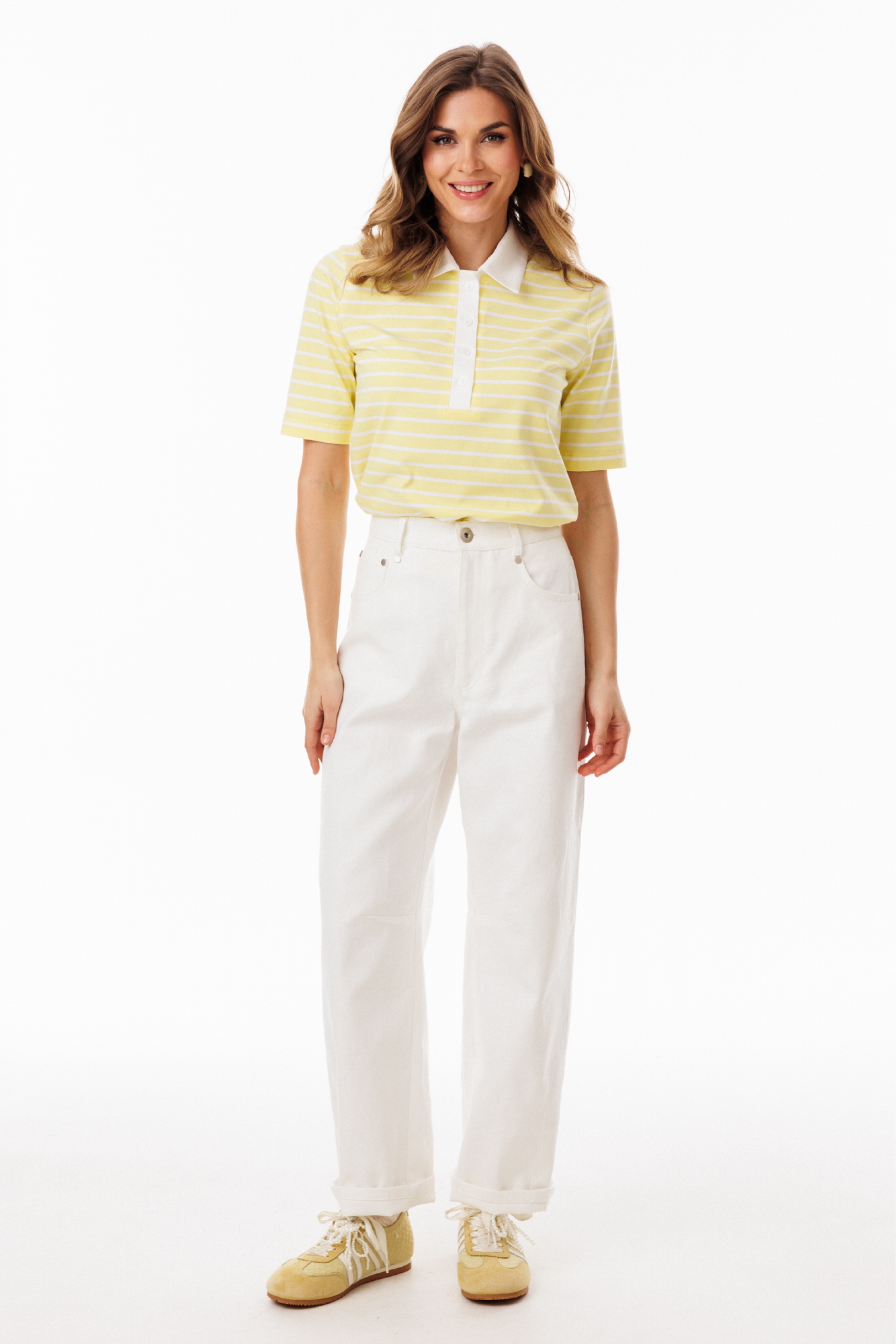 Джемпер выполнен из трикотажного полотна в полоску. Джемпер полуприлегающего силуэта, длиной выше линии бедер. Спереди застежка на пуговицы. Воротник стояче-отложной. Воротник и планка выполнены из гладкокрашенного трикотажного полотна. Плечевой шов удлинен. Рукав втачного покроя, одношовный, выше линии локтя.