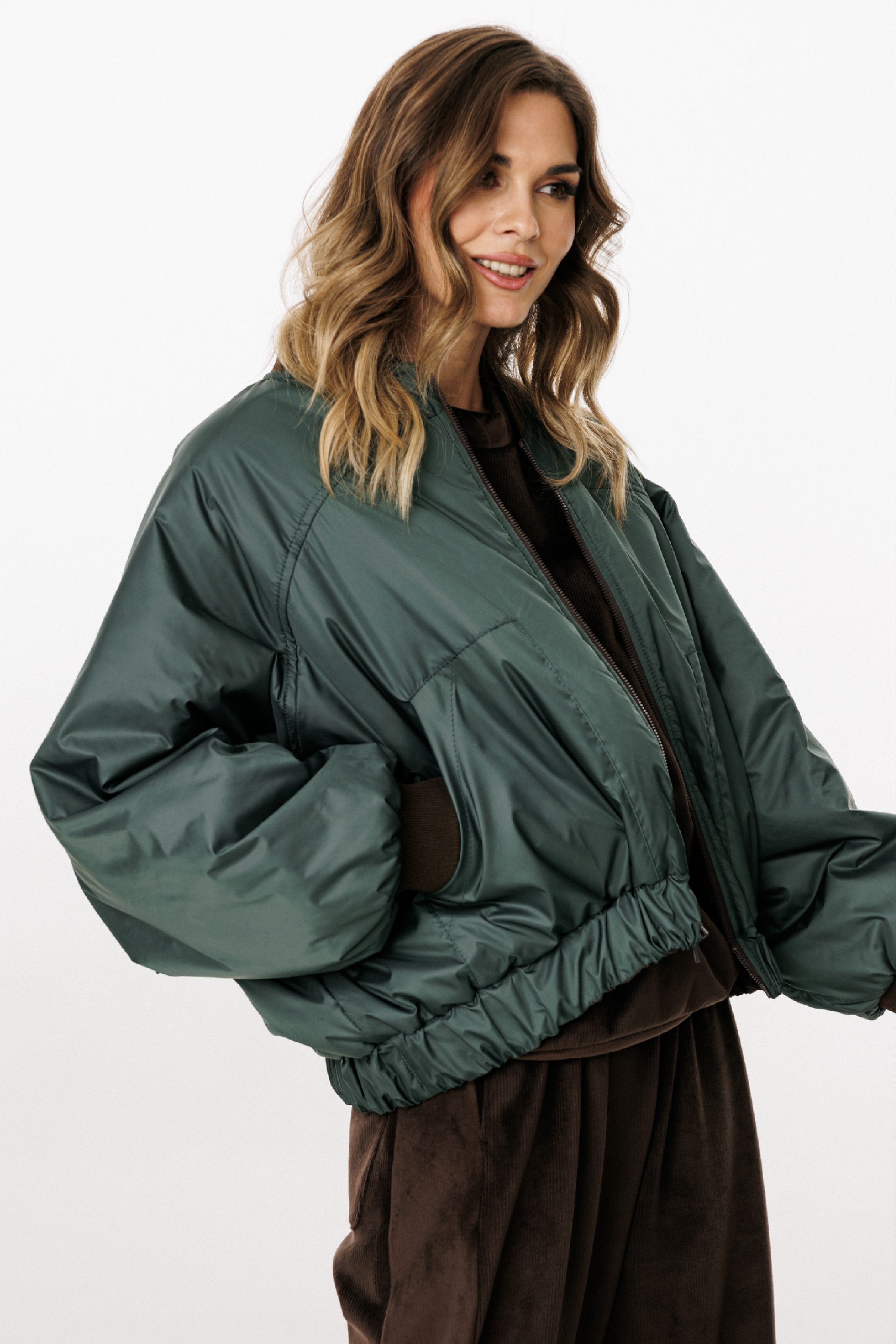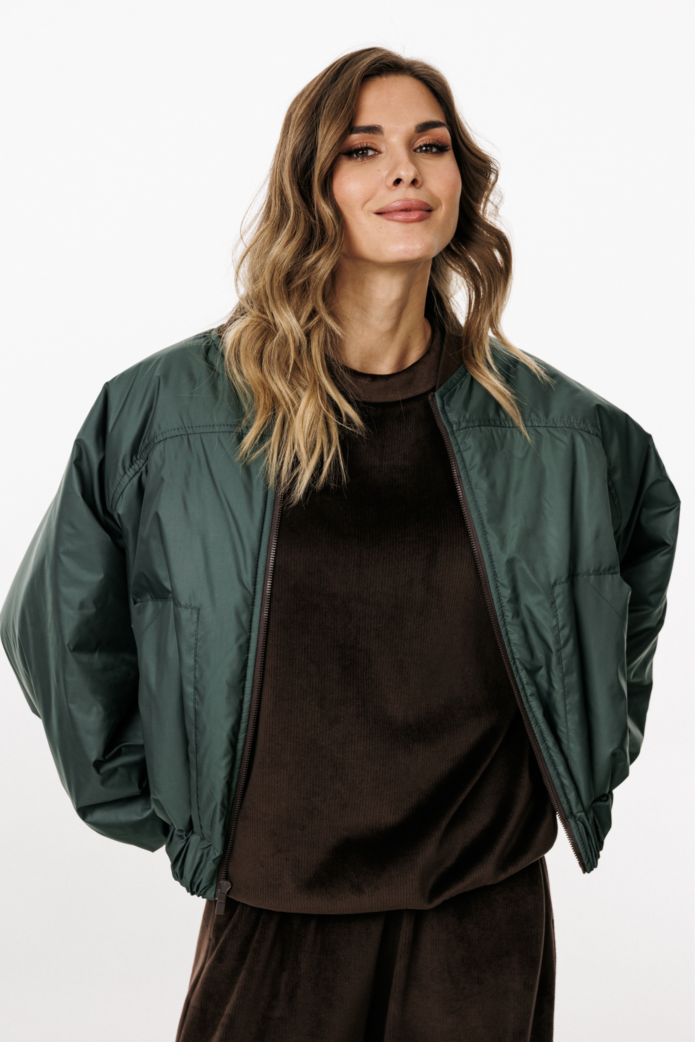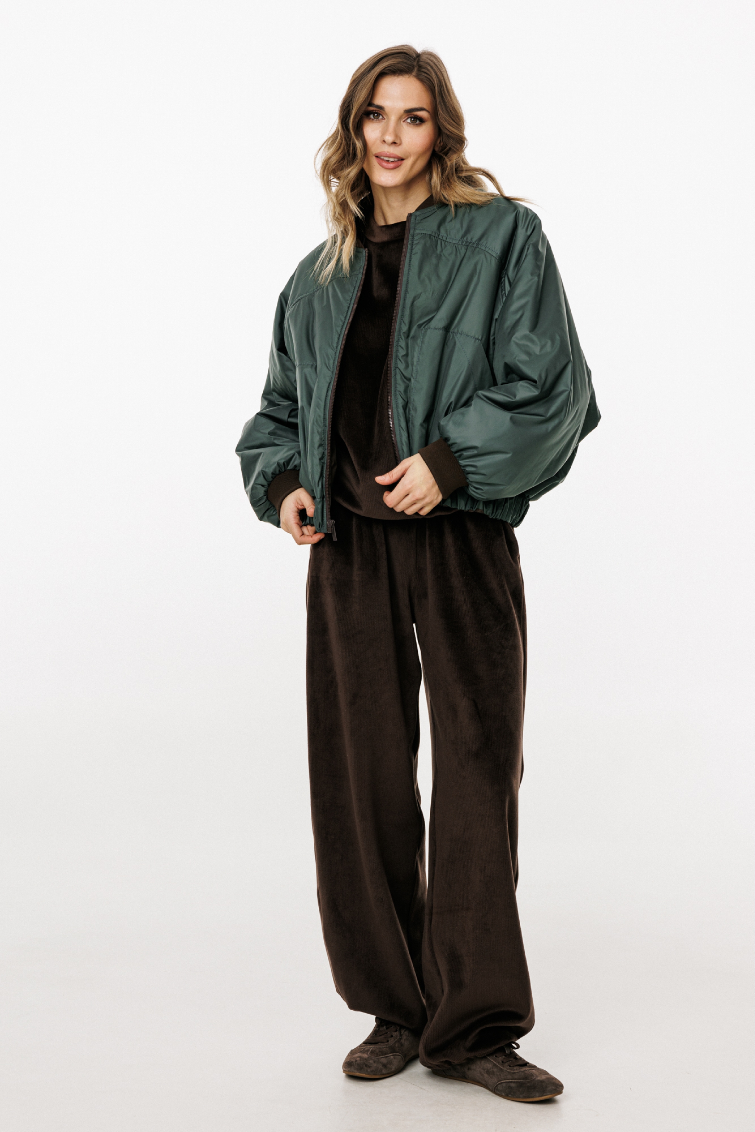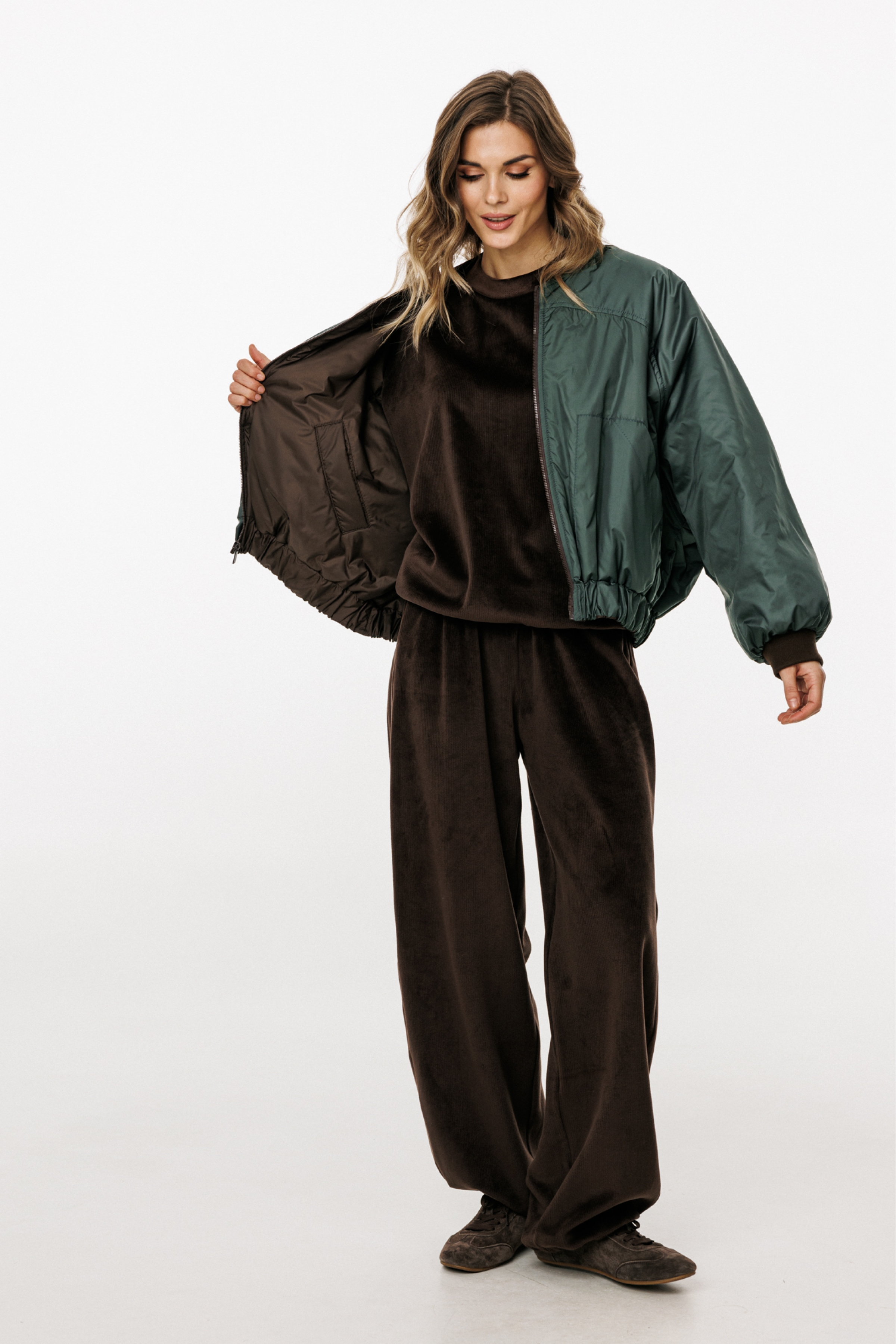 Комплект: джемпер+брюки. Комплект выполнен из двустороннего велюра в мелкий рубчик. Джемпер О-образного силуэта, покроя "oversize", длиной до линии бедер. Перед и спинка цельные. Горловина округлой формы, обработана бейкой. Плечевой шов удлинен. Рукав рубашечного покроя, одношовный. Низ рукава на манжете. Верхняя часть рукава переходит в кокетку переда т спинки и доходит до горловины. По низу джемпера обработан пояс. Пояс, манжеты, верхняя часть рукава и бейка горловины выполнены из основной, но без рубчика. Брюки на притачном поясе с эластичной тесьмой, прямого силуэта, длиной в пол, покроя "oversize". Боковой шов заменен лампасом. В швах лампаса карманы. Сзади накладные карманы. В пояс протянут шнур с наконечниками. По низу брюк втянута эластичная тесьма с фиксаторами. Лампасы и пояс выполнены из основной ткани, но без рубчика.