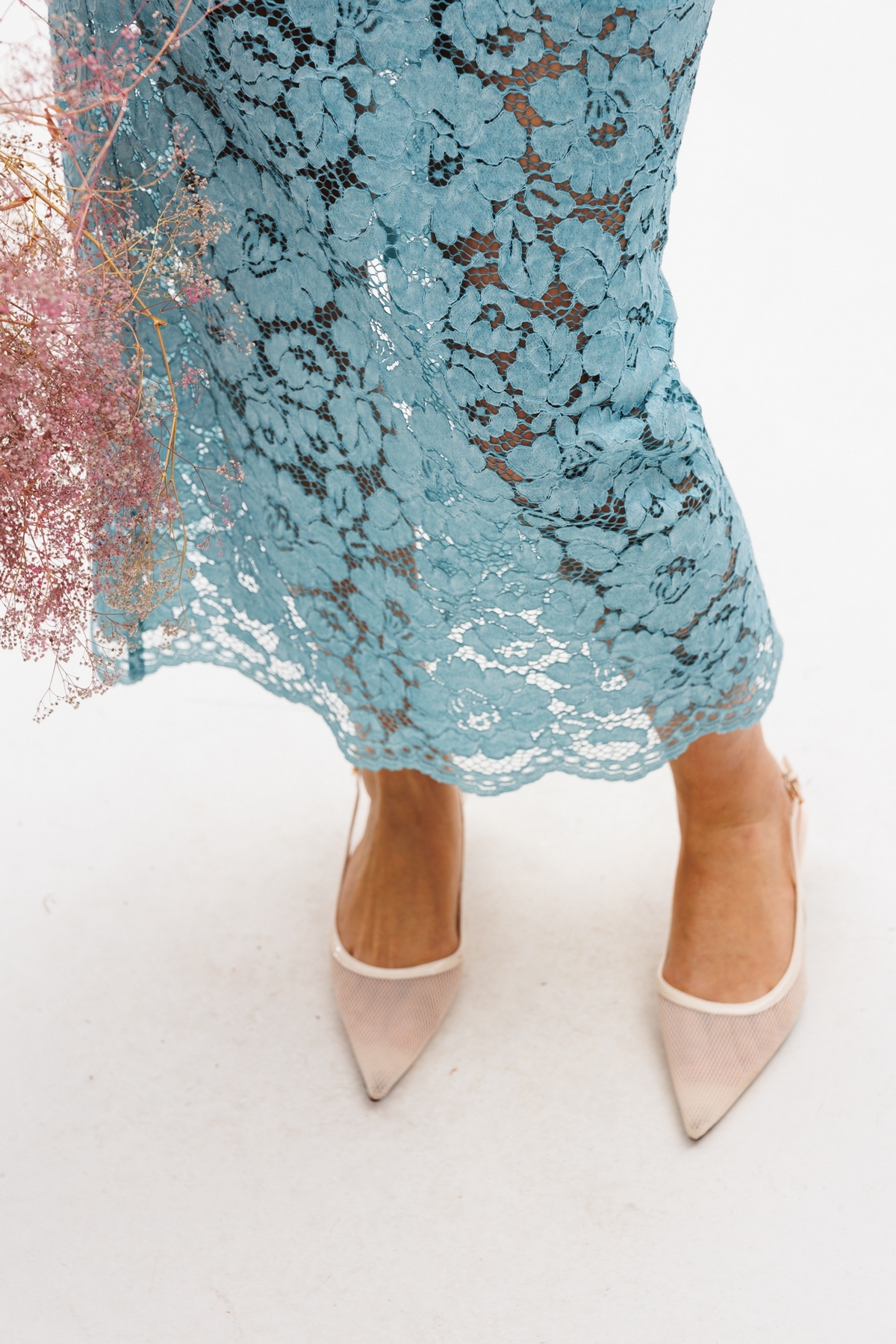 Юбка выполнена из гипюра. Юбка прямого силуэта длиной миди, на притачном поясе. На заднем полотнище в среднем шве застежка на потайную молнию. Пояс застегивается на петлю и пуговицу. По низу юбки фестоны. Юбка на короткой отлетной по низу подкладке.