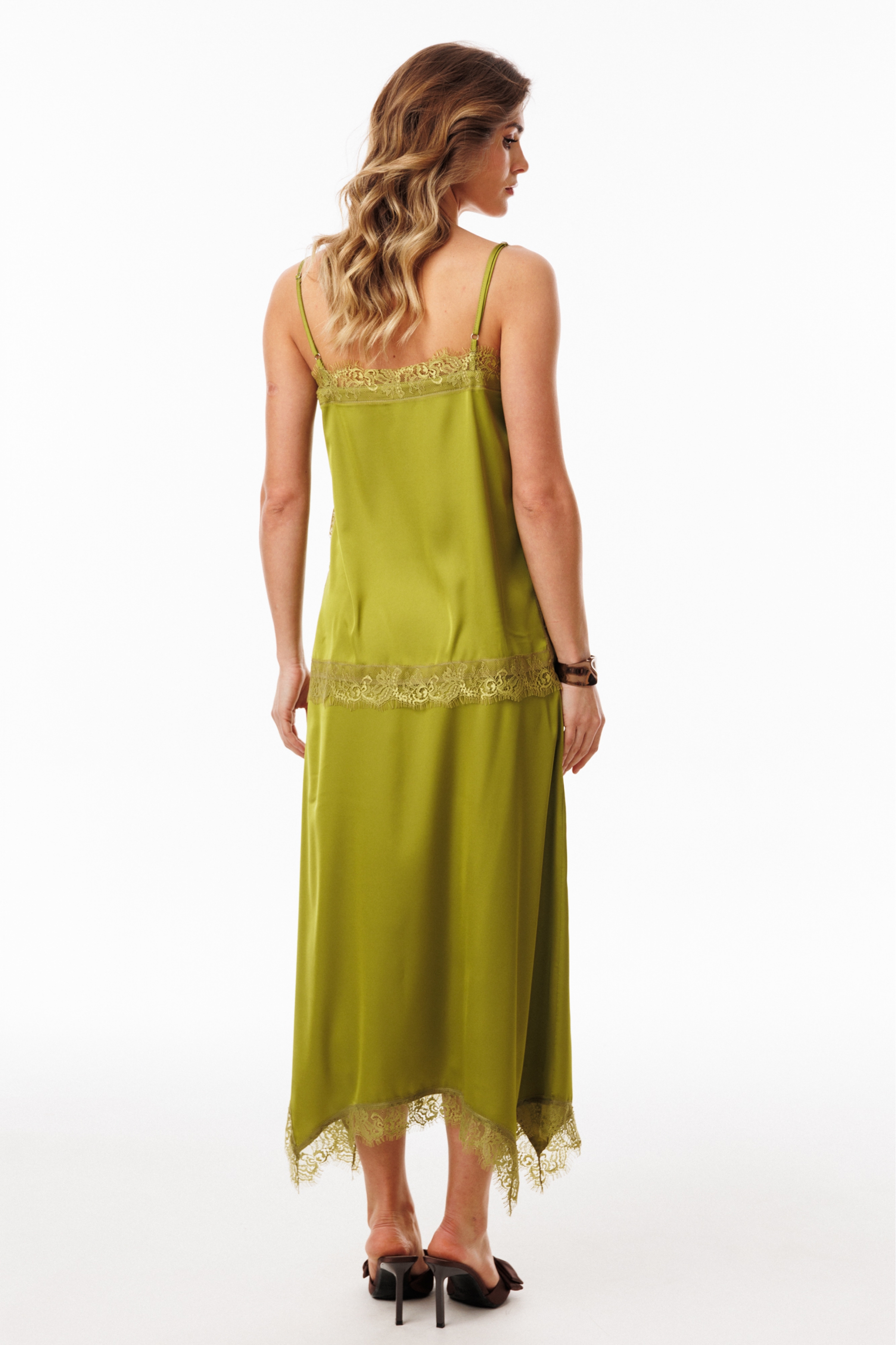 Юбка выполнена из тонкого атласа. Юбка А-образного силуэта, длиной миди. Переднее и заднее полотнище цельные и расширены к низу. Низ юбки фигурной формы, обработан кружевом. Застежка в левом боковом шве на потайную молнию и пуговицу. Юбка на подкладке из основной ткани.