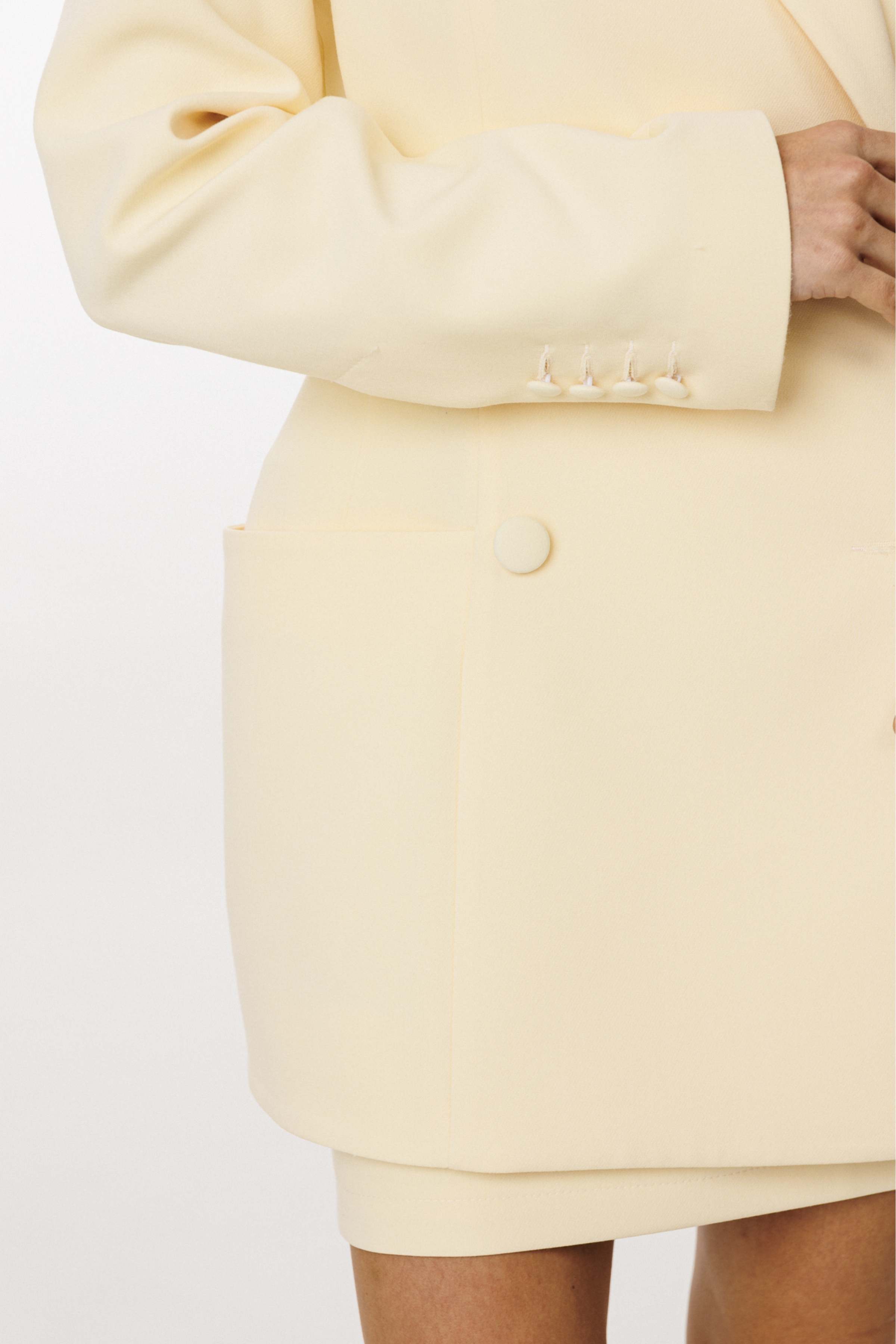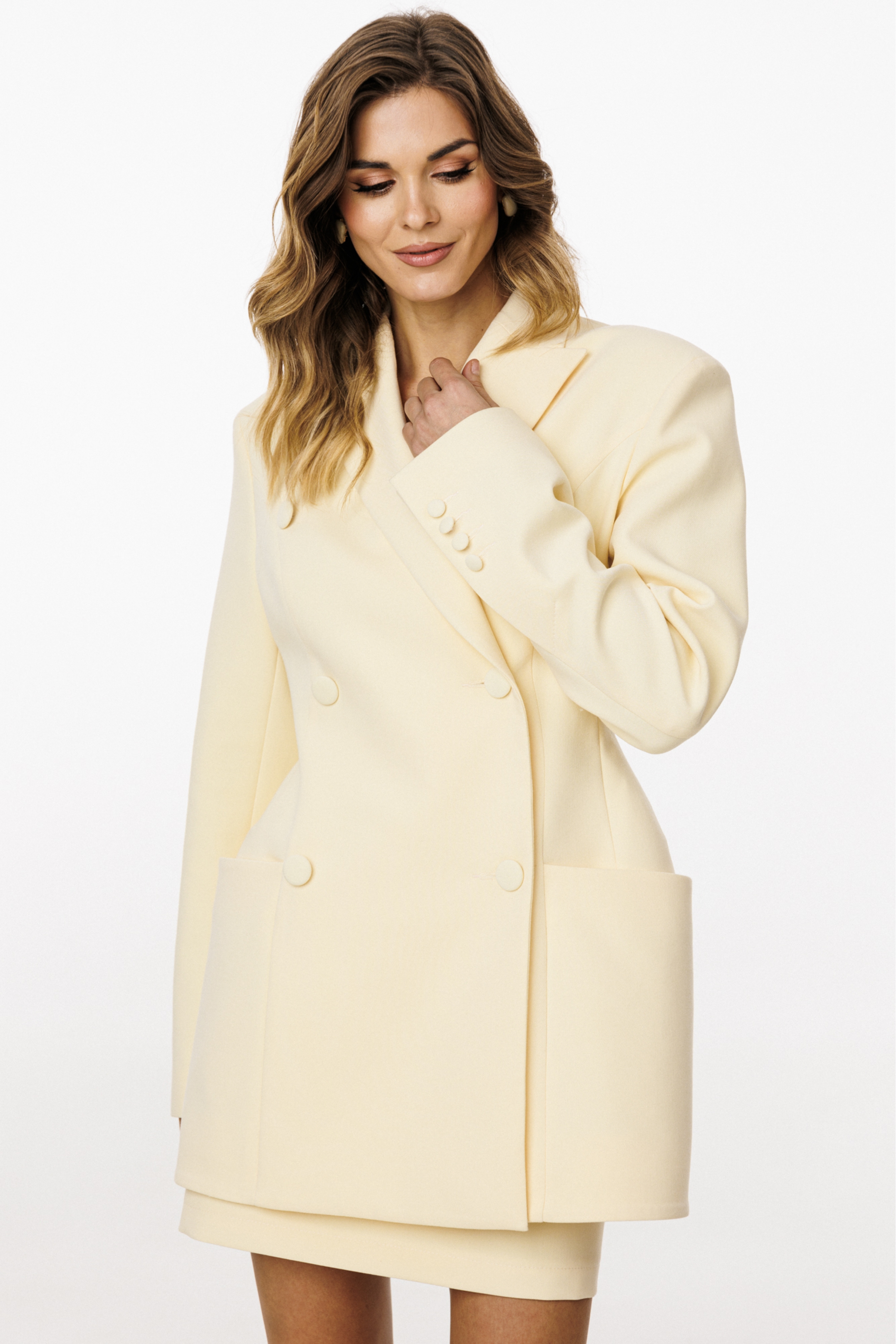 Жакет выполнен из костюмной ткани. Жакет К-образного силуэта, длиной ниже линии бедер. По переду обработаны рельефы от проймы до низа, талиевые вытачки, горизонтальные подрезы, переходящие на спинку, в которых обработаны карманы и лацканы. На спинке обработаны две пары рельефов от проймы до низа и средний шов. Воротник пиджачного типа. Жакет с плечевыми накладками, плечевой шов удлинен. Рукав втачной, двухшовный. По низу рукав обработан шлицей, застёгивающеюся на 4 петли и пуговицы. Жакет двубортный, на притачной по низу подкладке.