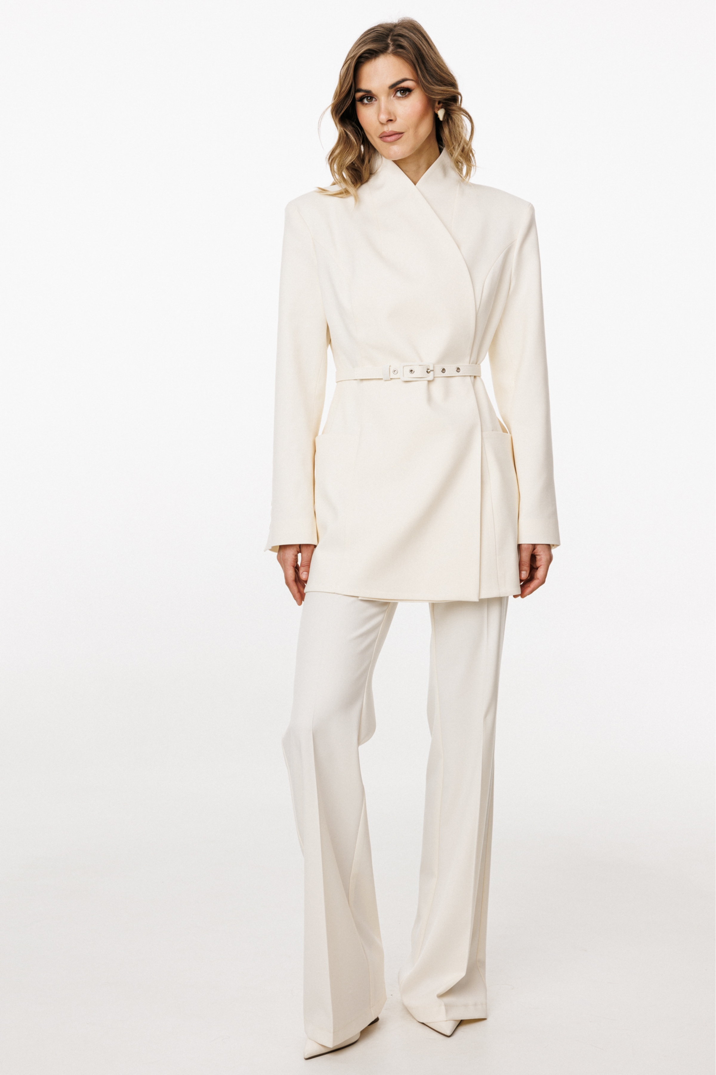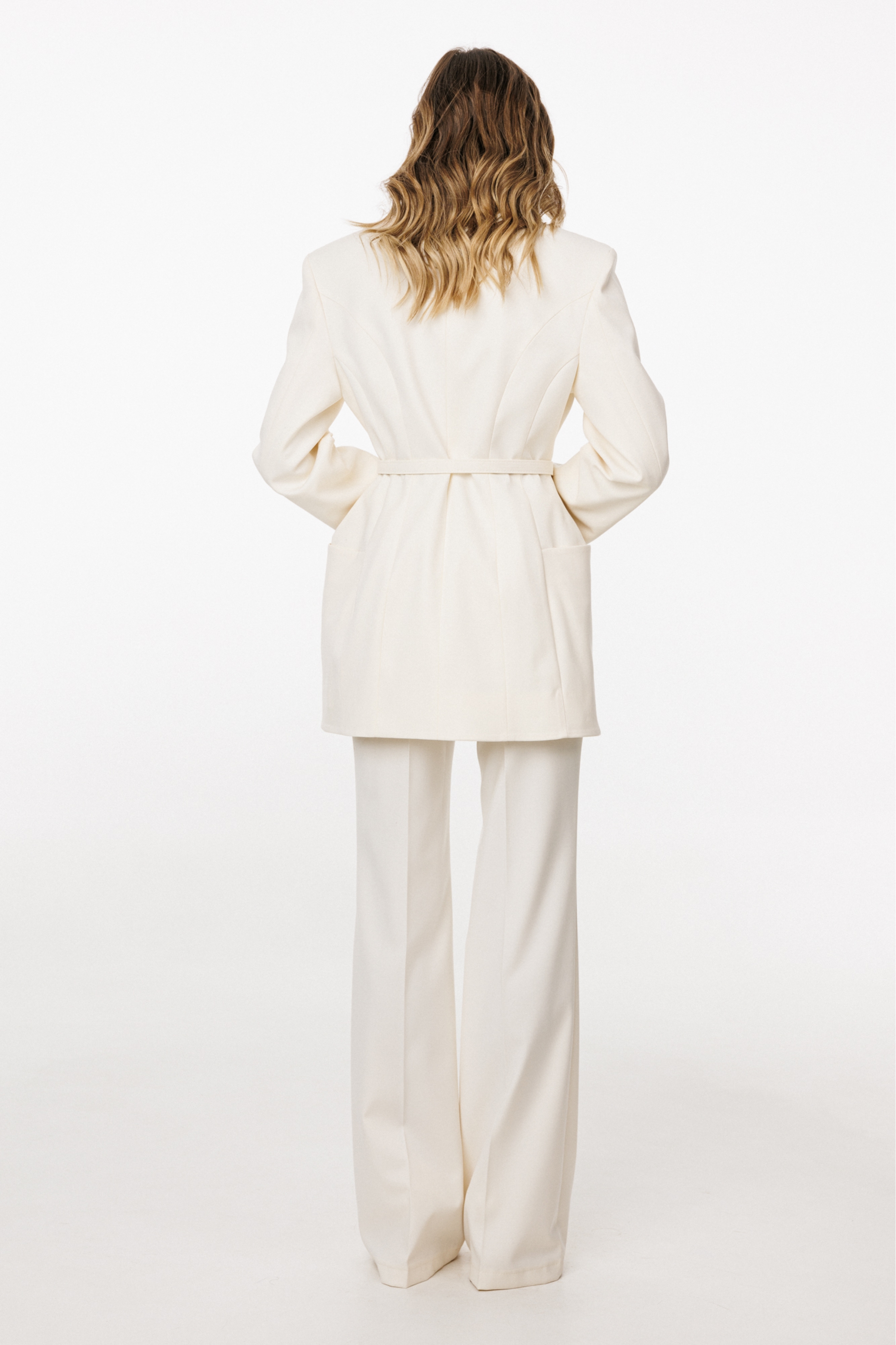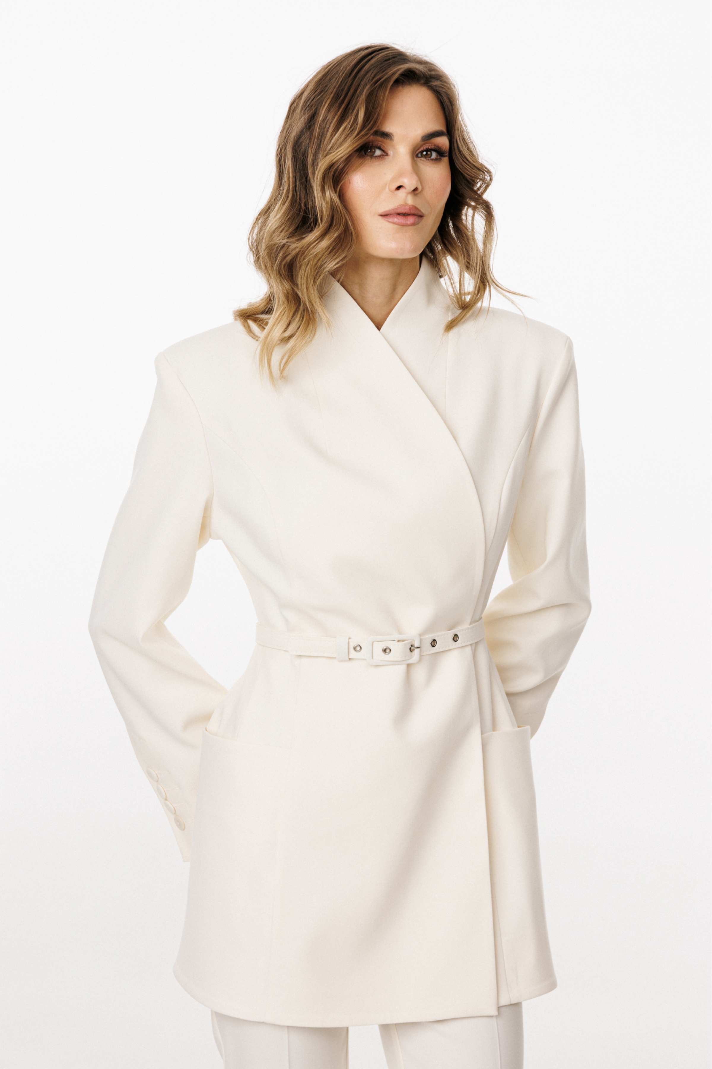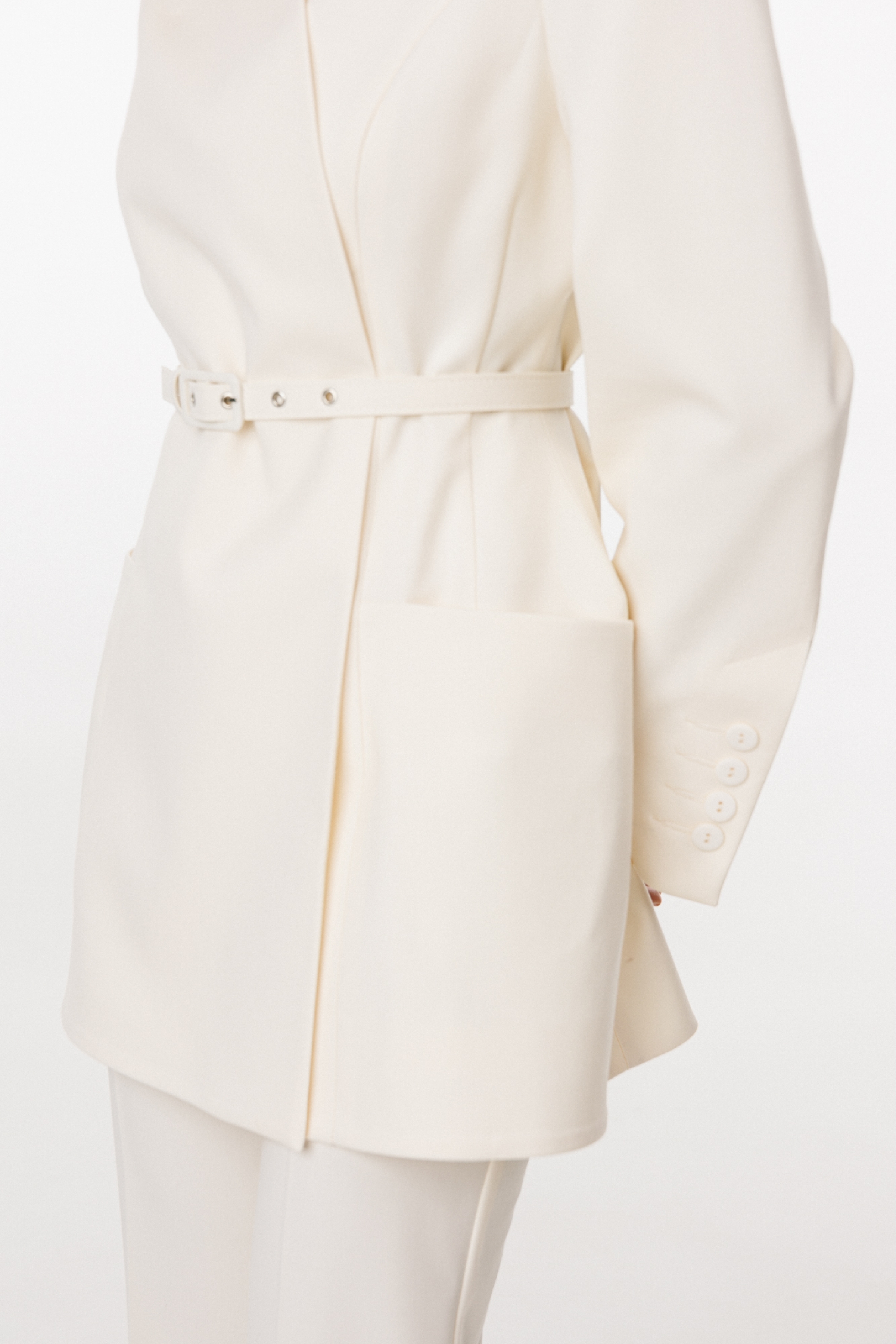 Жакет выполнен из костюмной ткани. Жакет К-образного силуэта, длиной ниже линии бедер. По переду обработаны рельефы от проймы до низа, талиевые вытачки, горизонтальные подрезы, переходящие на спинку, в которых обработаны карманы, двубортная застёжка на два ряда пришивных кнопок. На спинке обработаны две пары рельефов от проймы до низа. Жакет с плечевыми накладками, плечевой шов удлинен.
