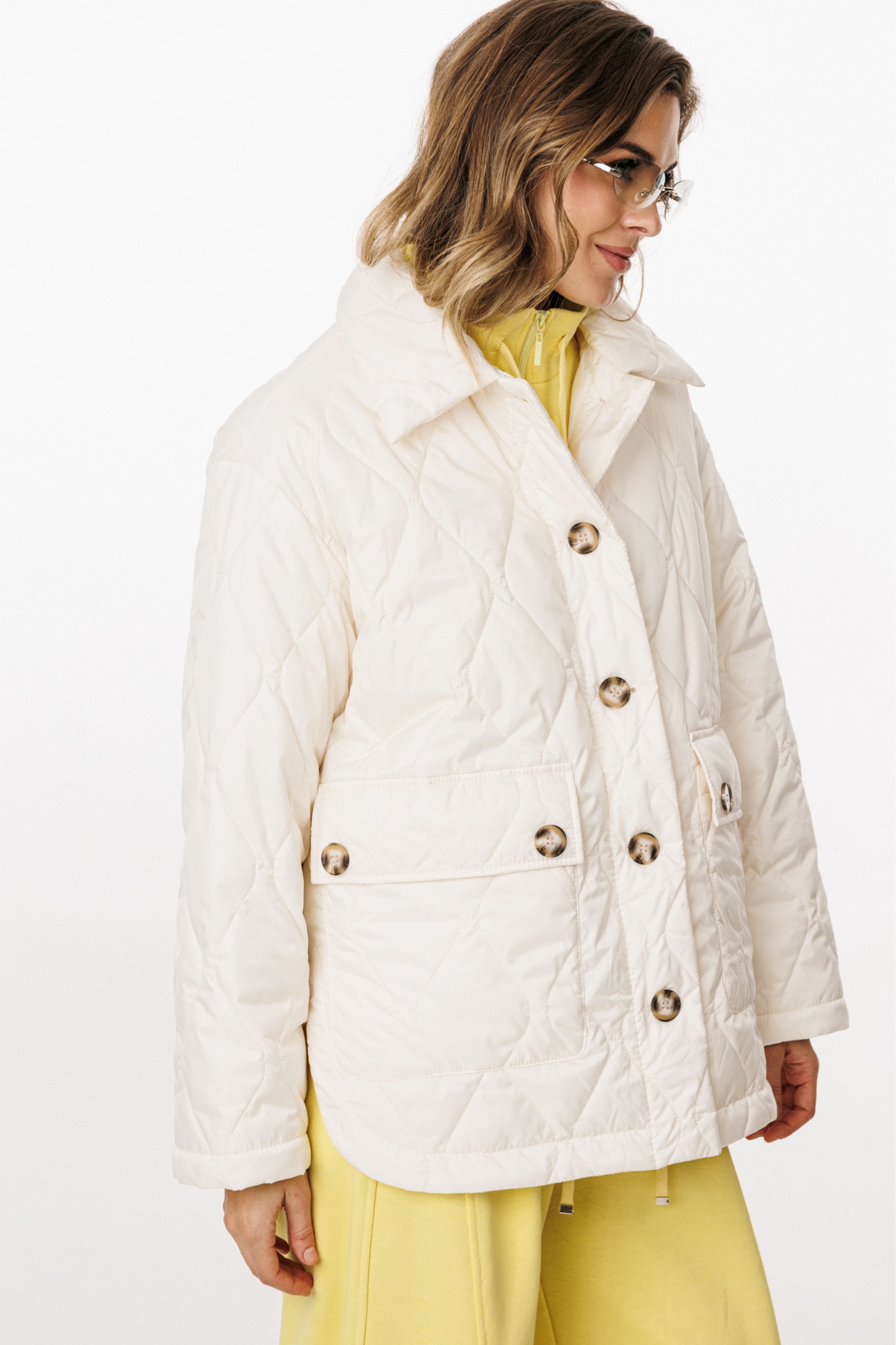 Куртка выполнена из плащевой ткани, простеганной с Isosoft. Куртка прямого силуэта, длиной до линии бедер. Застежка центральная бортовая на пришивные пуговицы. Спереди накладные карманы с клапанами. Спинка цельная. Воротник стояче-отложной. Рукав втачной, двухшовный. Плечевой шов спущен. Пройма углублена. Спинка длиннее переда. В боковых швах фигурные разрезы.