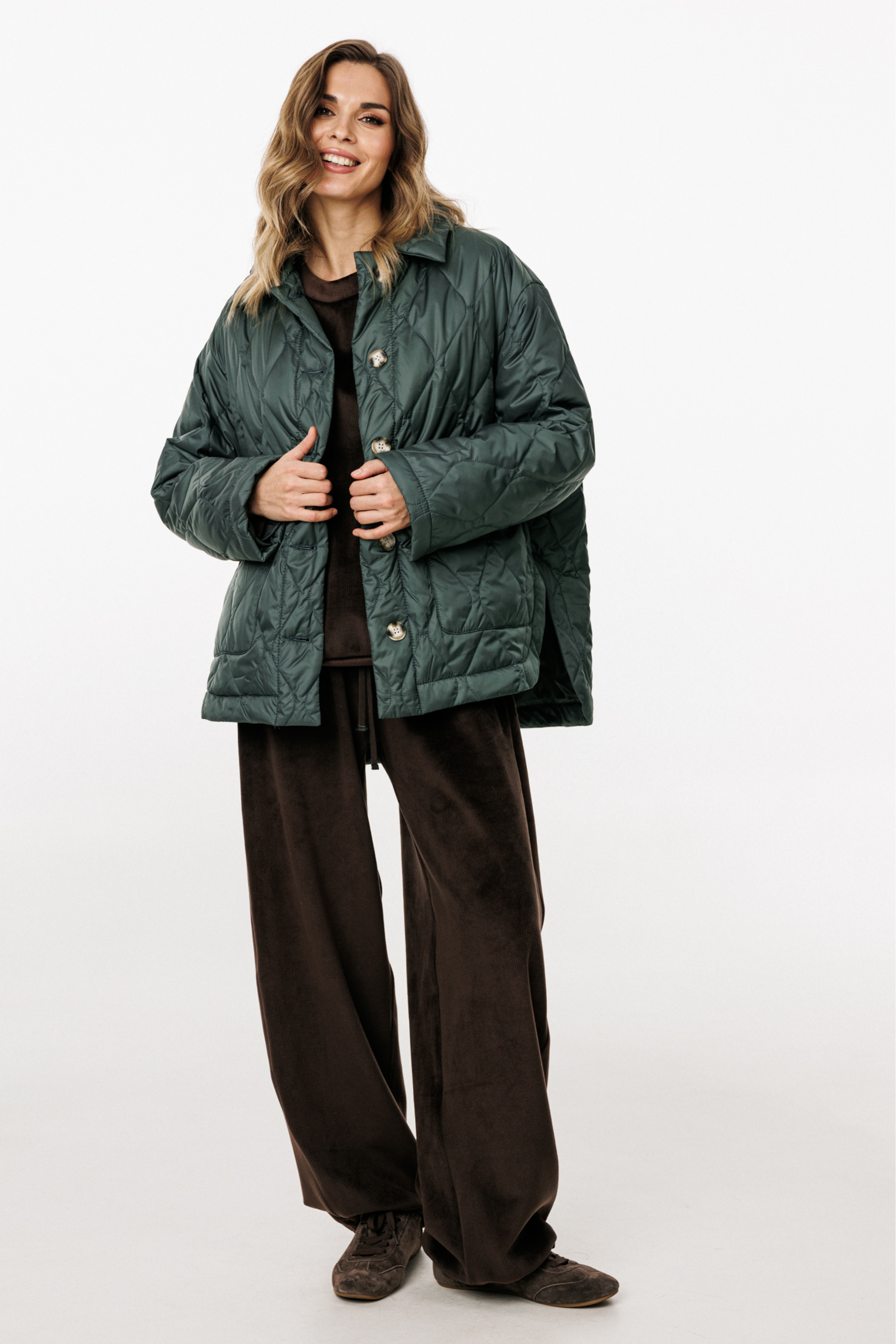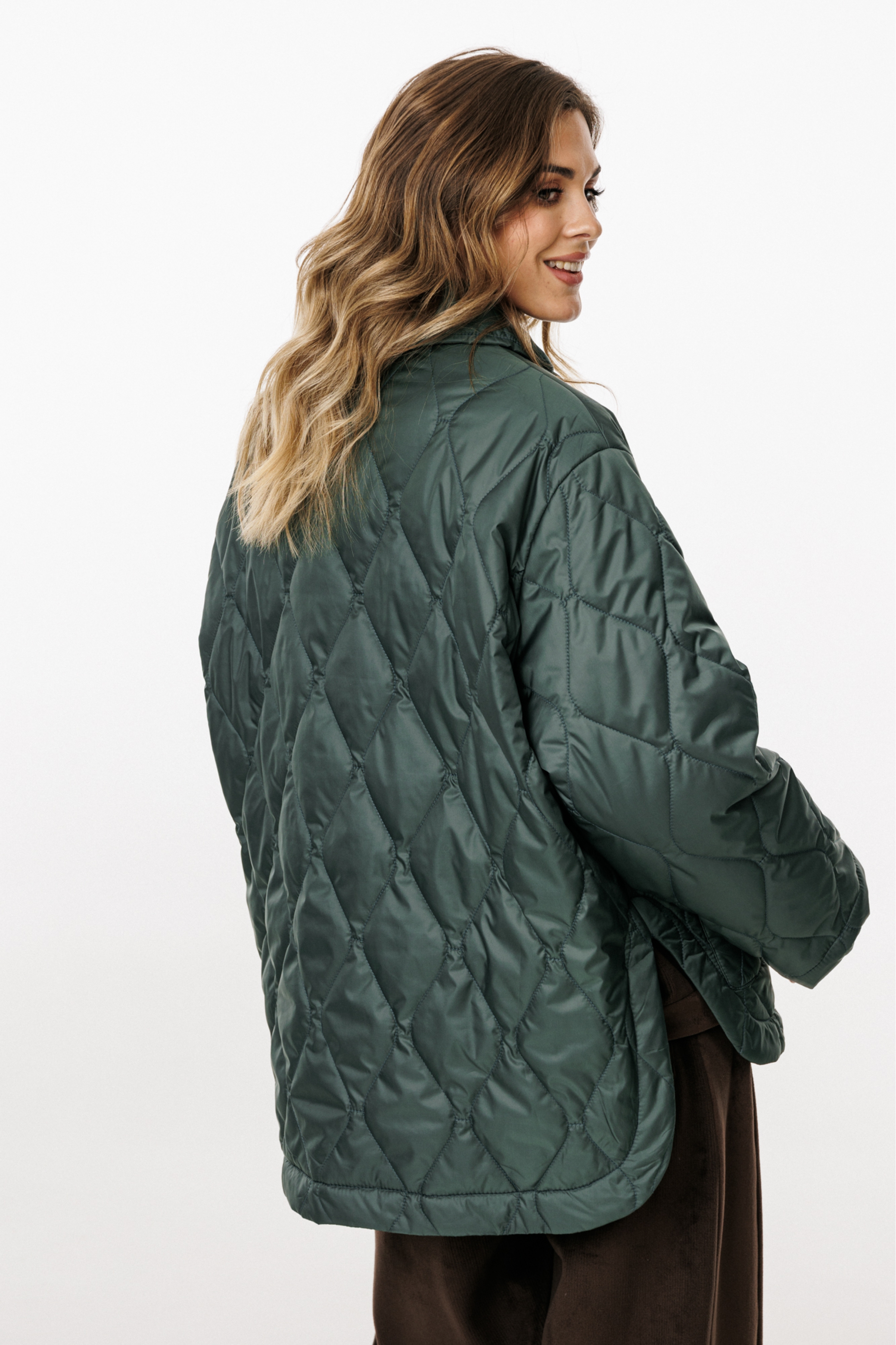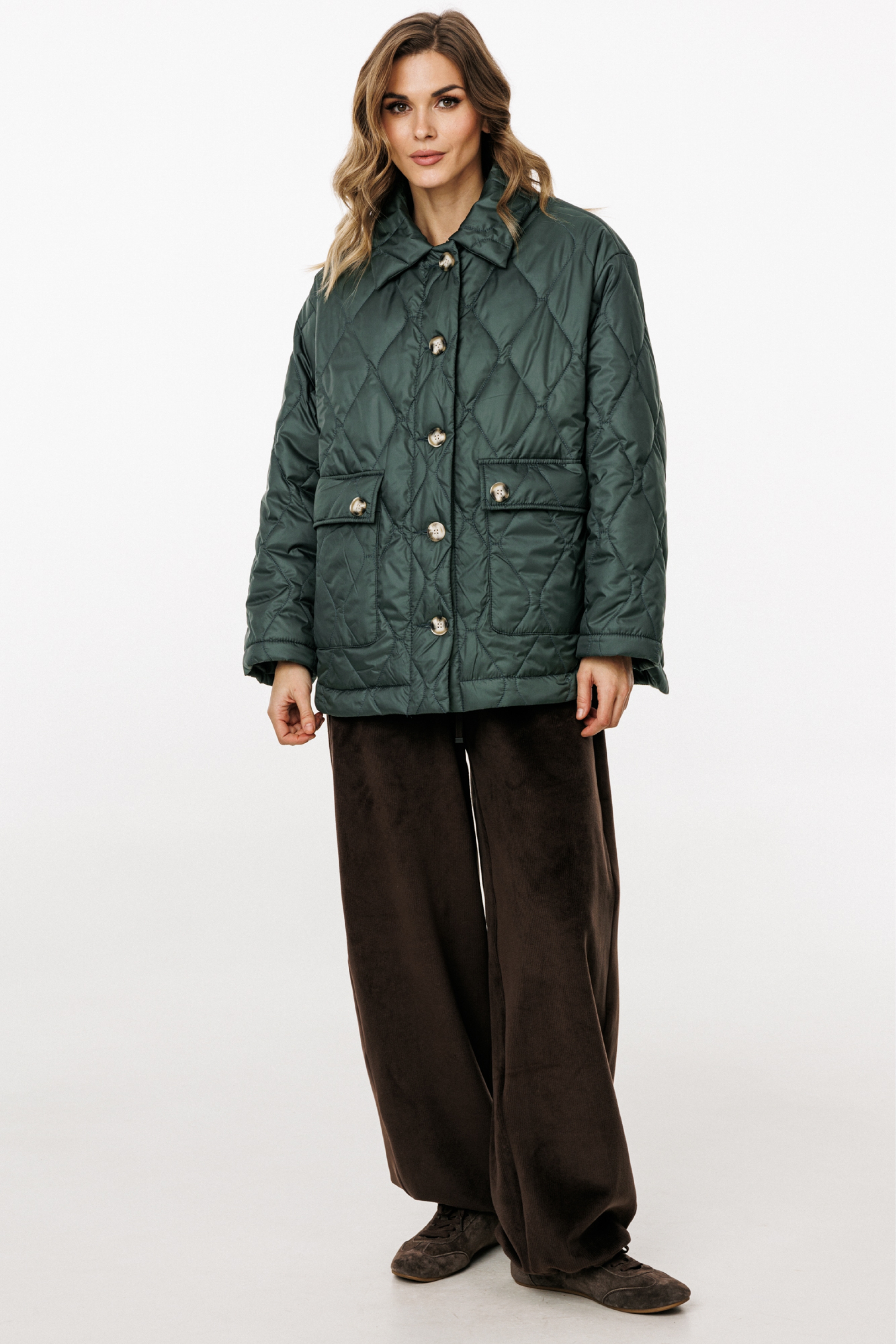 Куртка выполнена из плащевой ткани, простеганной с Isosoft. Куртка прямого силуэта, длиной до линии бедер. Застежка центральная бортовая на пришивные пуговицы. Спереди накладные карманы с клапанами. Спинка цельная. Воротник стояче-отложной. Рукав втачной, двухшовный. Плечевой шов спущен. Пройма углублена. Спинка длиннее переда. В боковых швах фигурные разрезы.