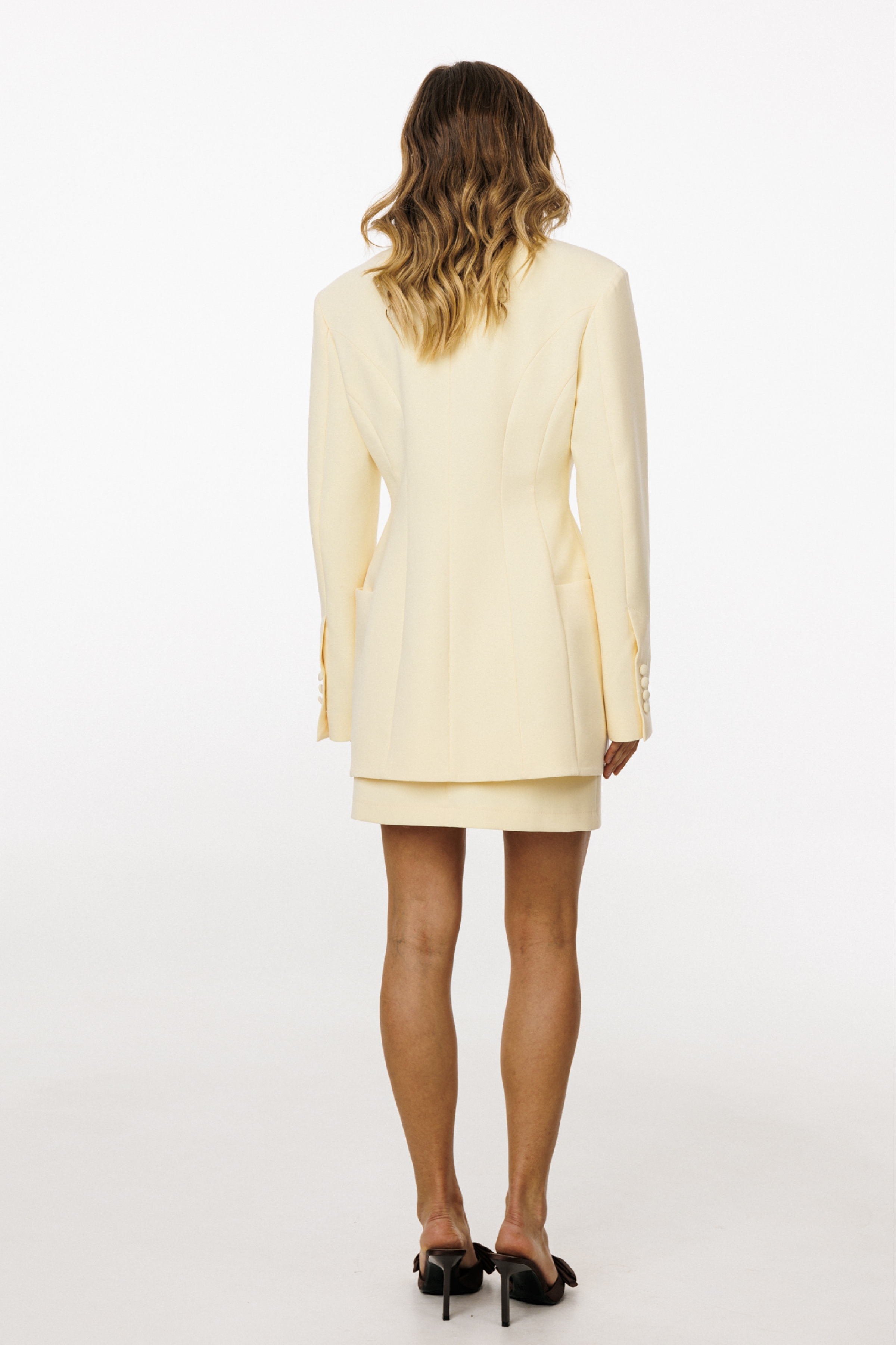 Юбка выполнена из костюмной ткани. Юбка прямого силуэта, длиной выше колена. Юбка на притачном поясе, на переднем полотнище обработаны две пары талиевых вытачек и средний шов с застежкой на потайную молнию. Пояс с застёжкой на петлю и пуговицу. Юбка на отлетной по низу подкладке.